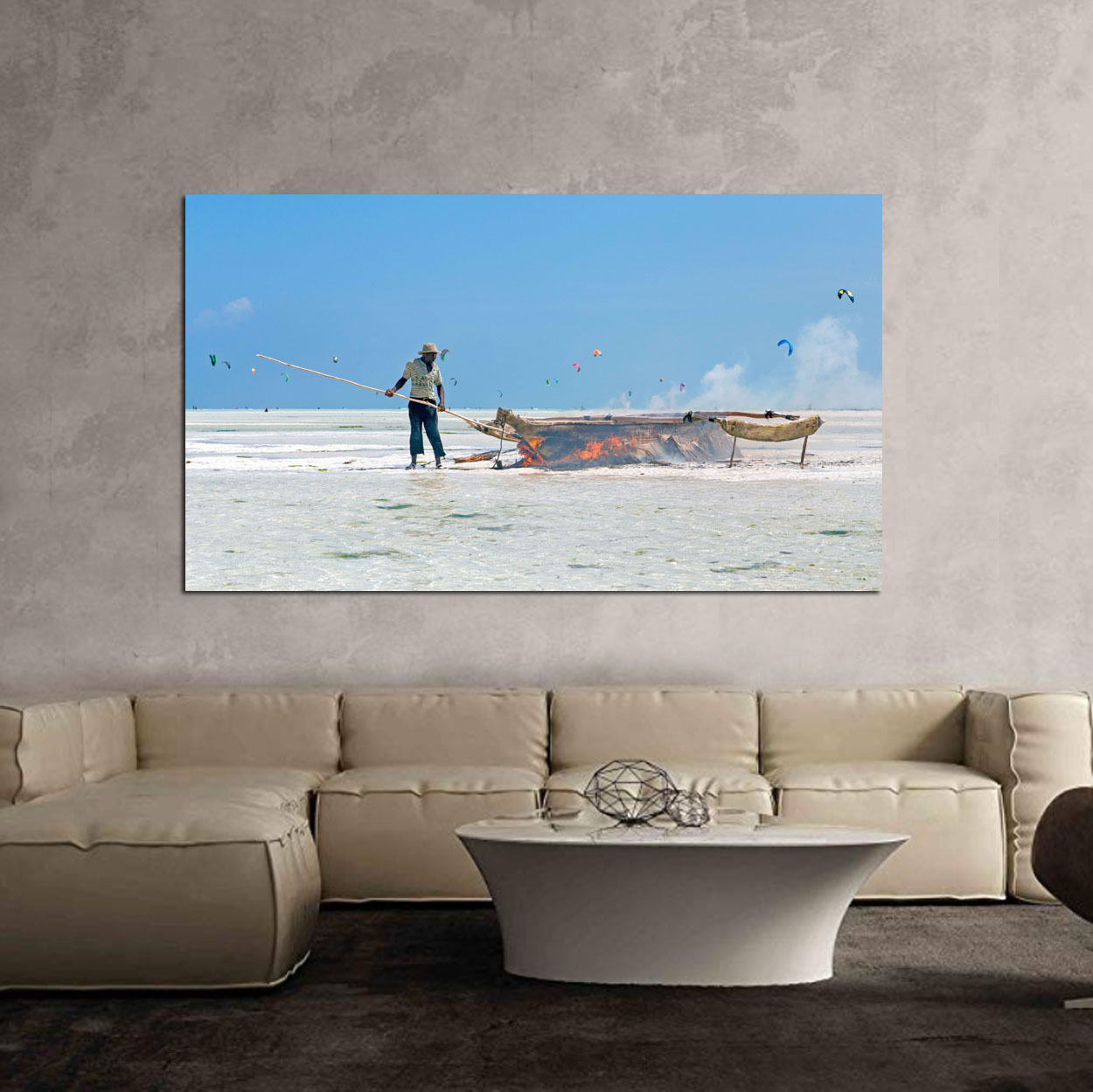 A fishing boat on a beach in Zanzibar. Kiteboarders in the background provide the stark contrast between two different cultures.